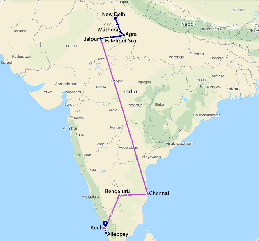 Delhi – Jaipur – Fatehpur Sikri – Agra – Mathura - Chennai - Bangalore - Cochin - Alleppey